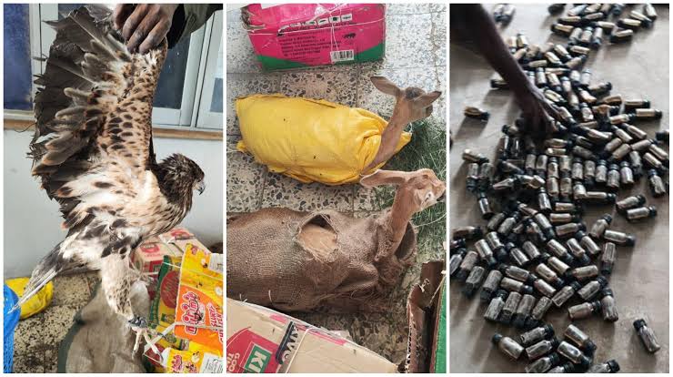 He listed the items seized to include two live antelopes, one dead antelope, one porcupine, two civet cats, four eagles and 13 live tortoises.