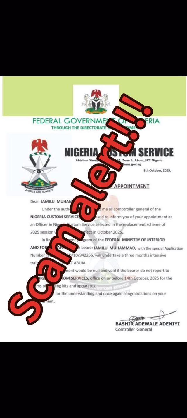 The Nigeria Customs Service (NCS) says the appointment letters circulating online for its recruitment exercise are fake.