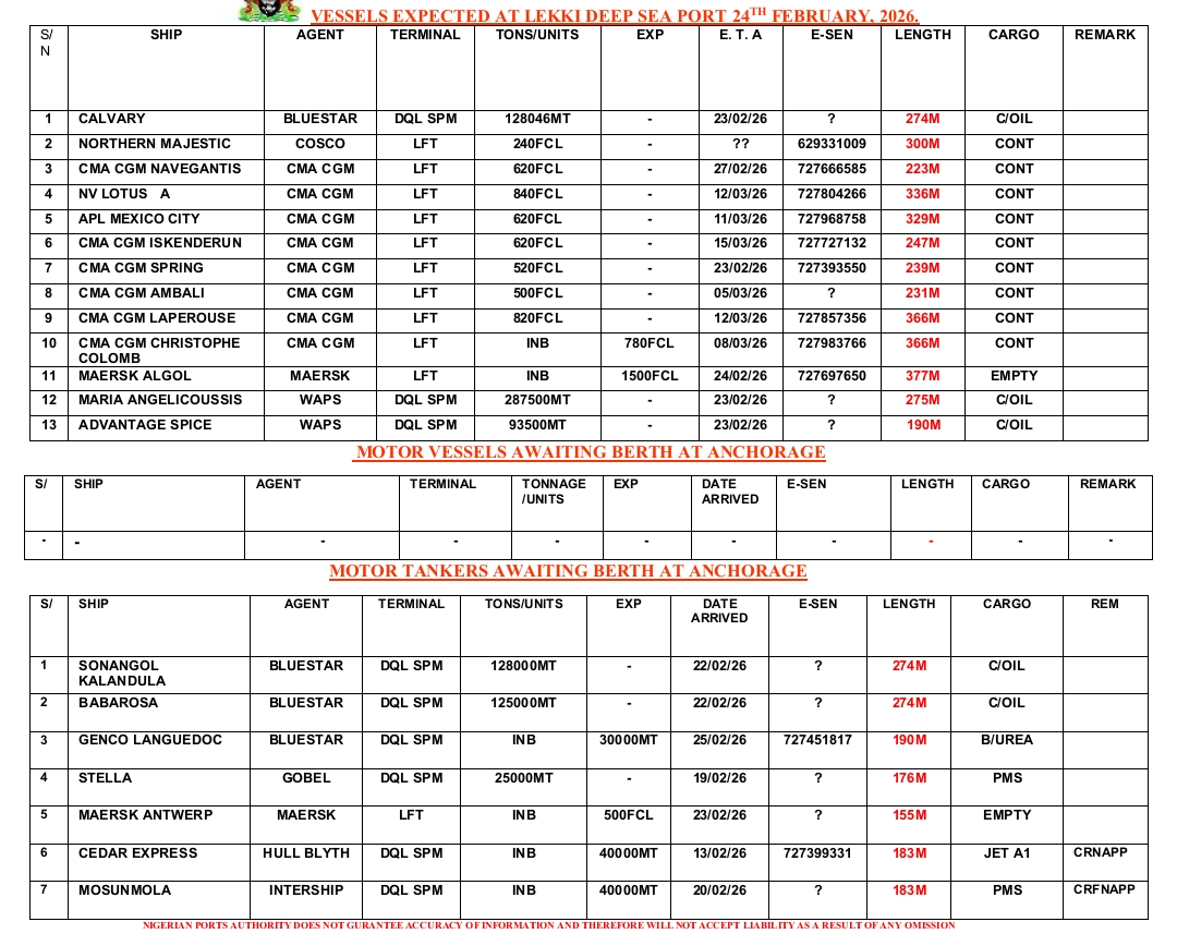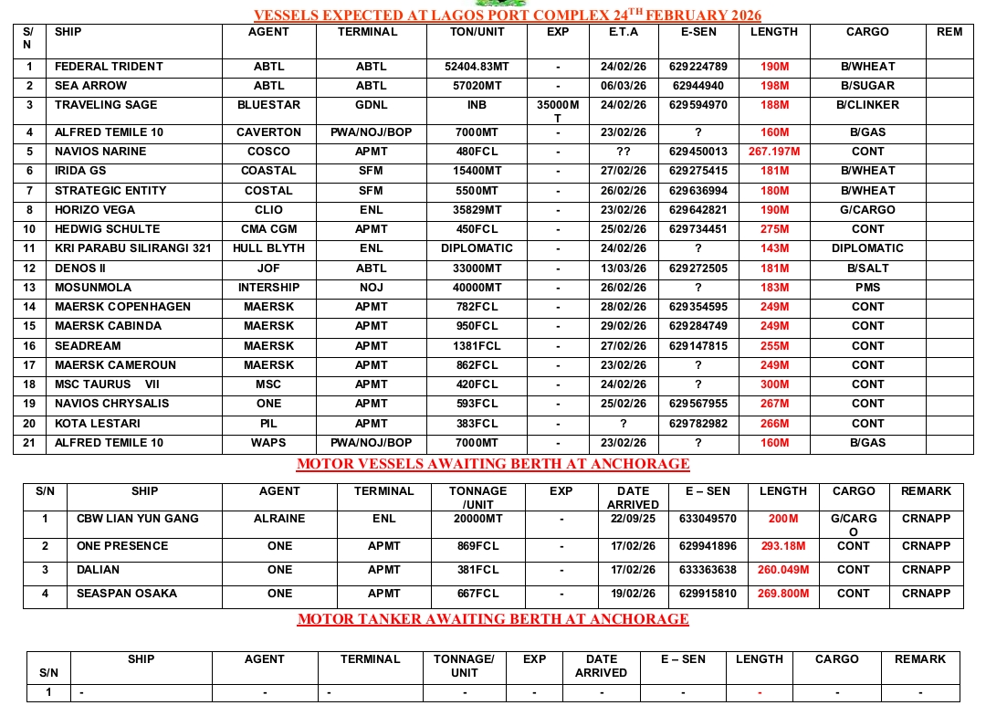 Home » Vessels Expected At Lagos Ports 24th February, 2026