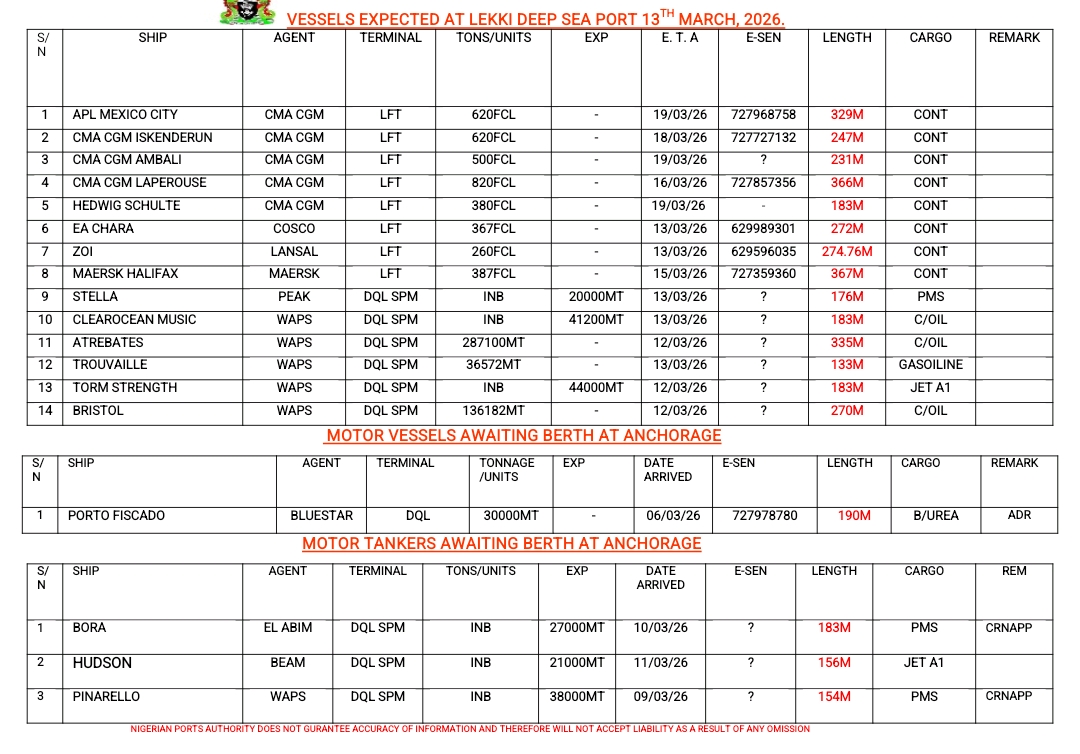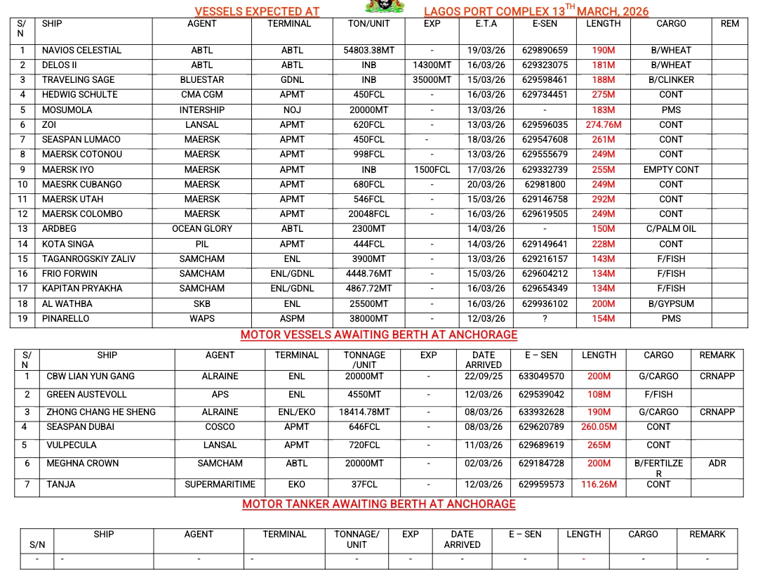 Home » Vessels Expected At Lagos Ports As At 13th March, 2026
