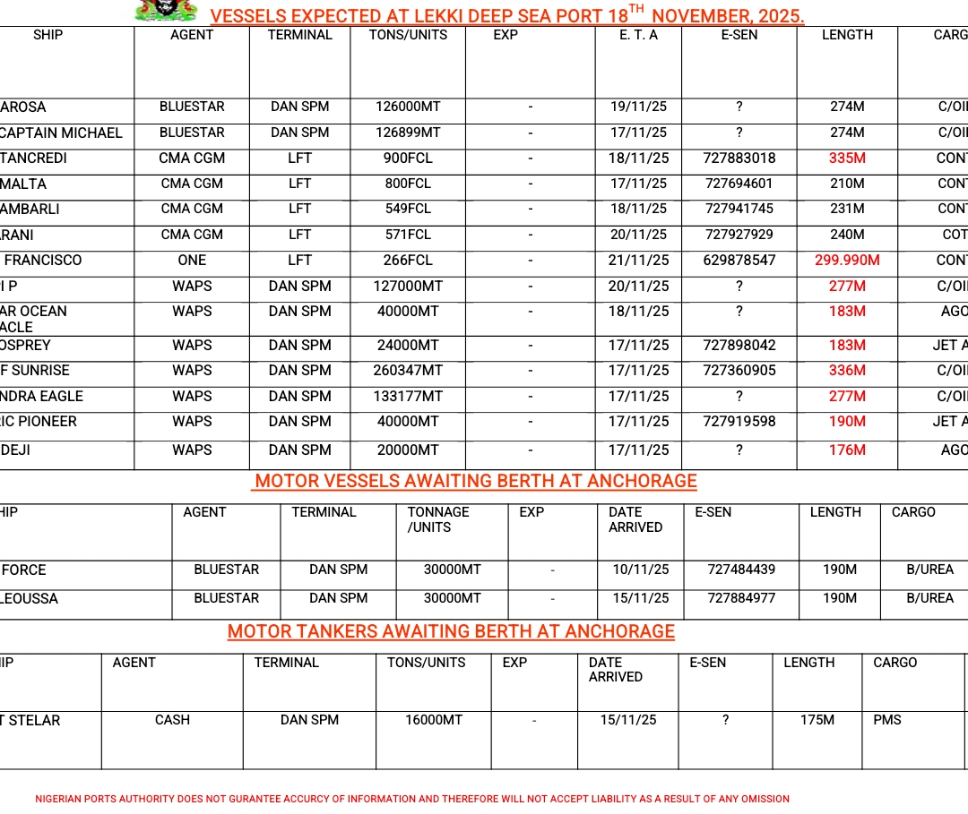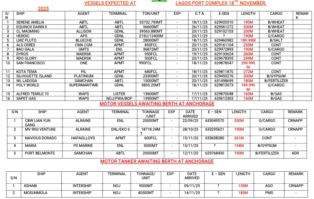 Home » Vessels Expected At Lagos Ports As At 18th November, 2025