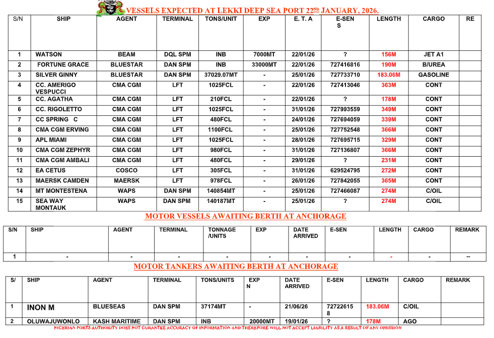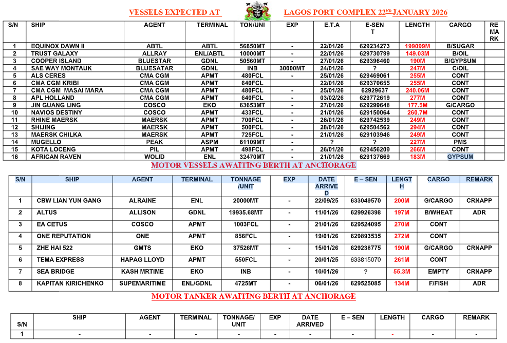 Home » Vessels Expected At Lagos Ports As At 22nd January, 2026