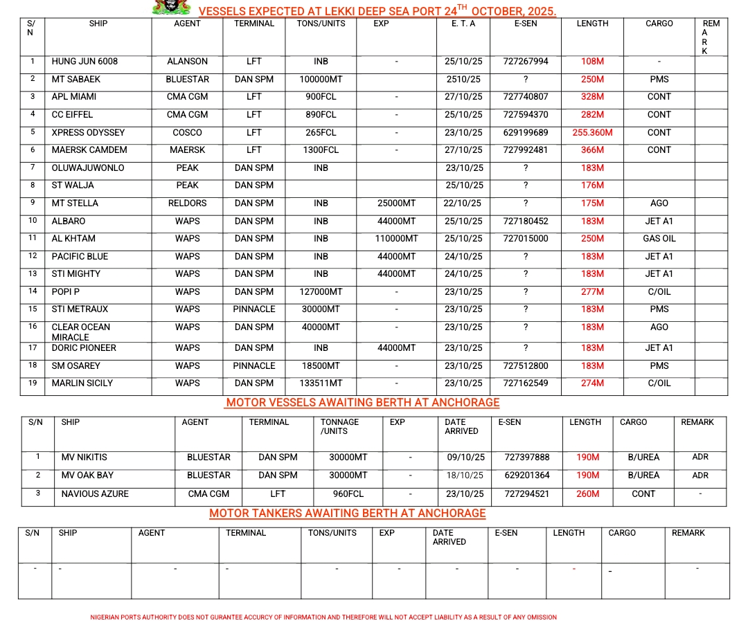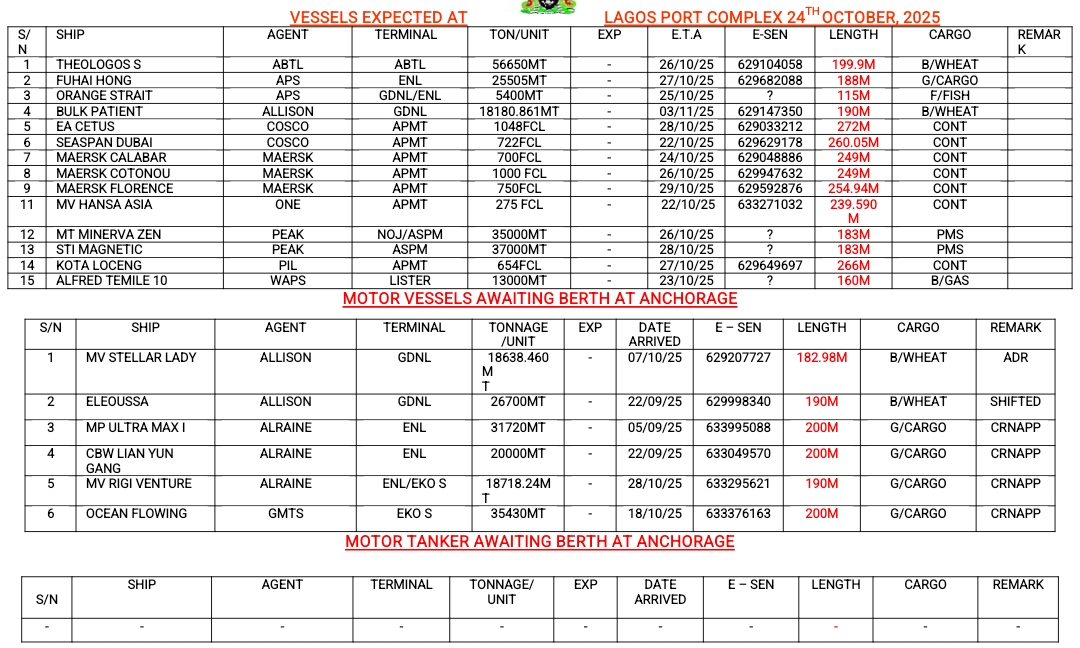 Vessels Expected At Lagos Ports As At 24th October, 2025