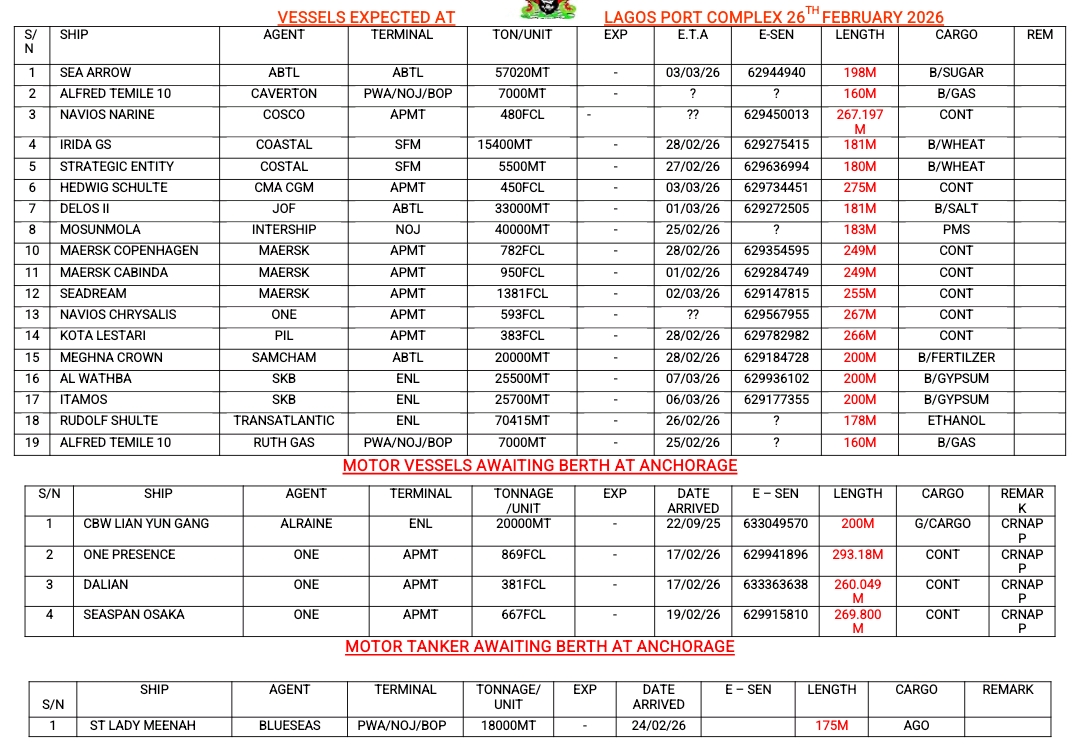 Home » Vessels Expected At Lagos Ports As At 26th February, 2026