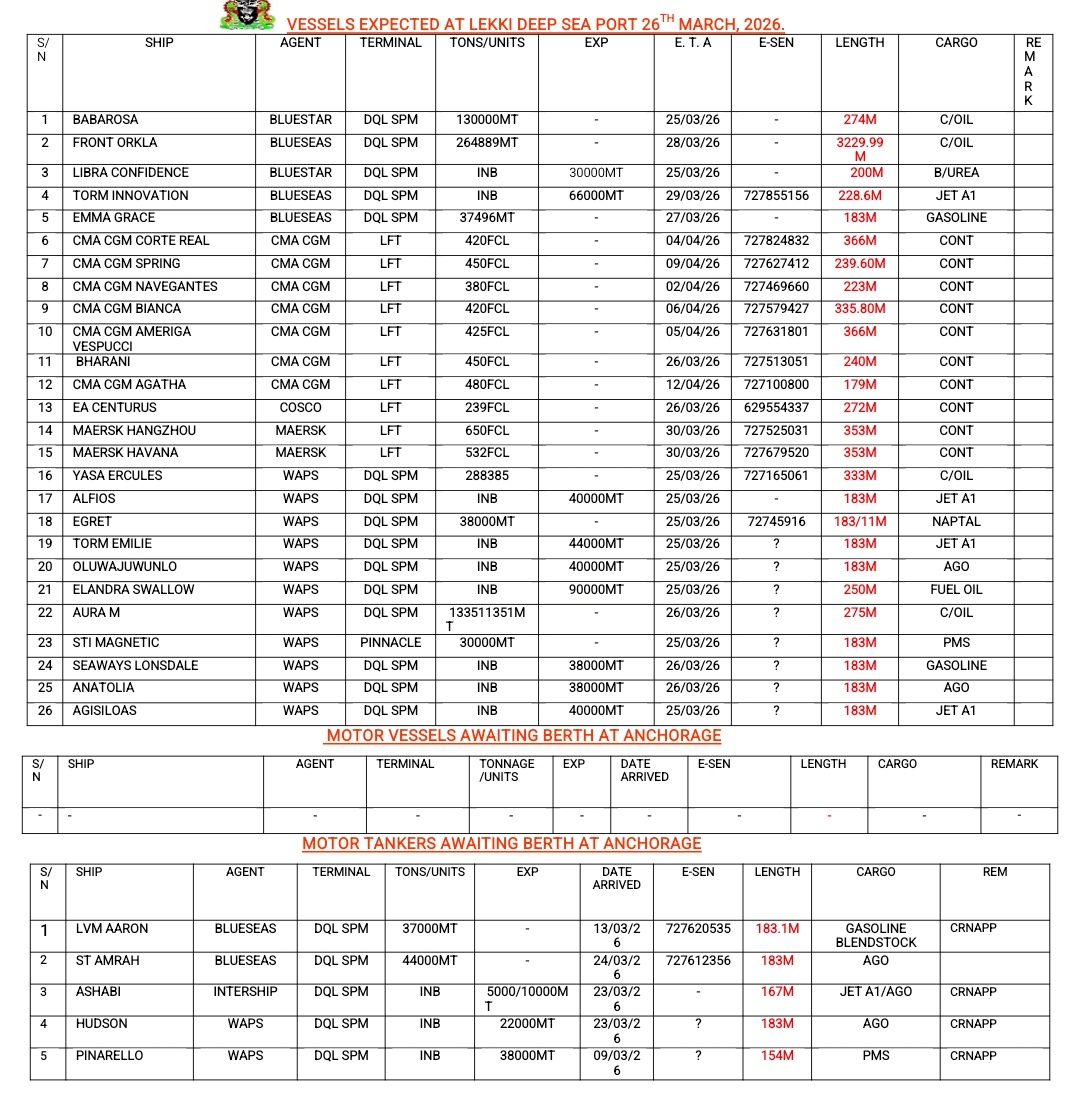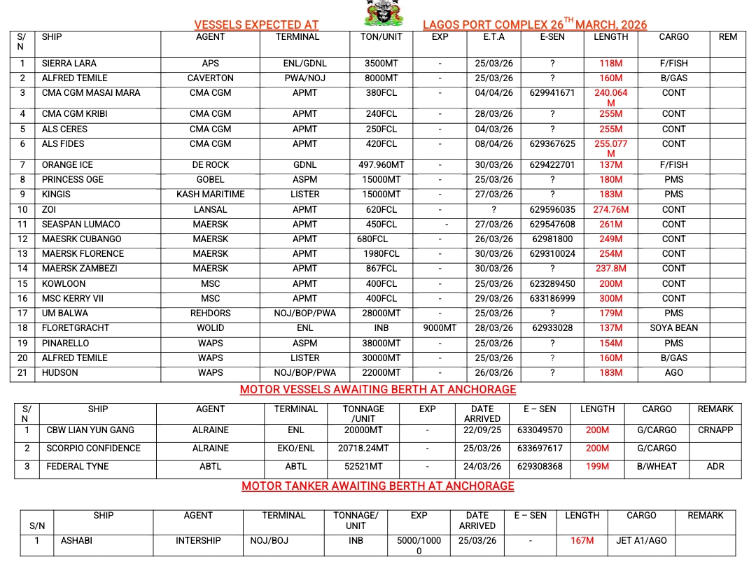 Vessels Expected At Lagos Ports As At 26th March, 2026