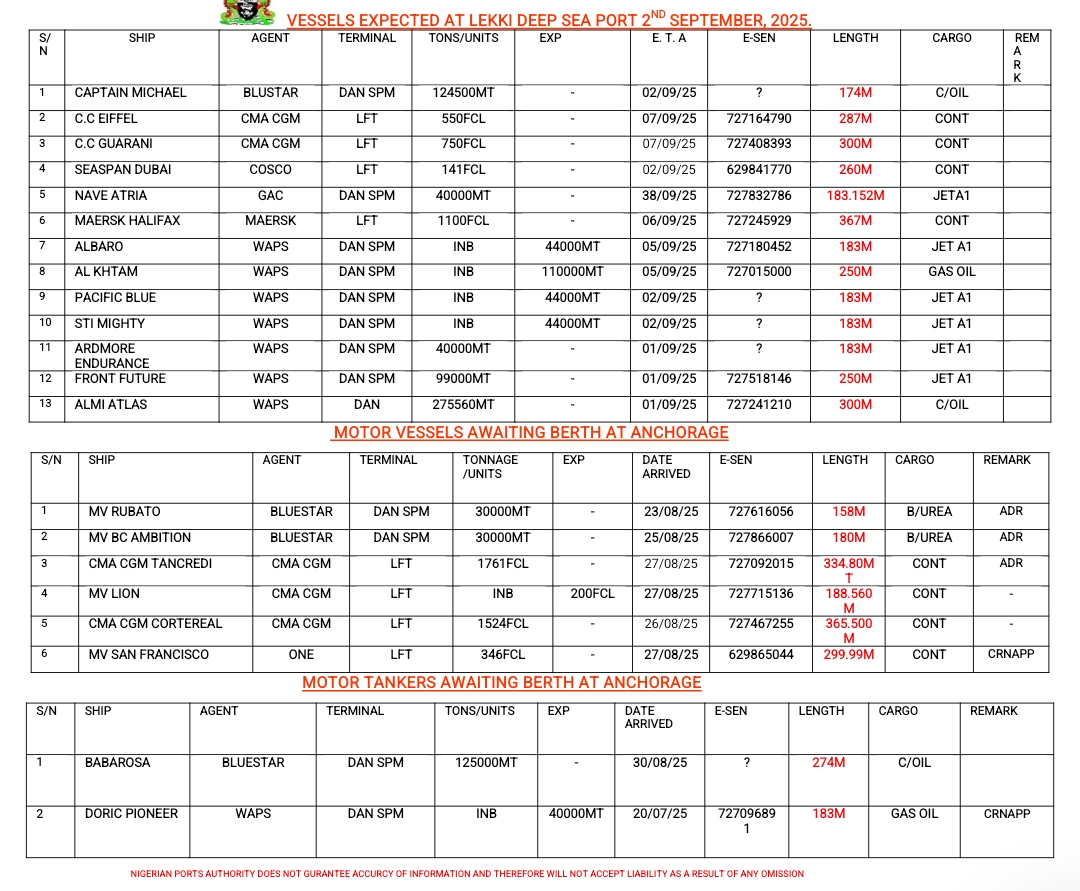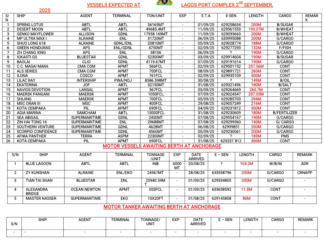 Home » Vessels Expected At Lagos Ports As At 2nd September, 2025