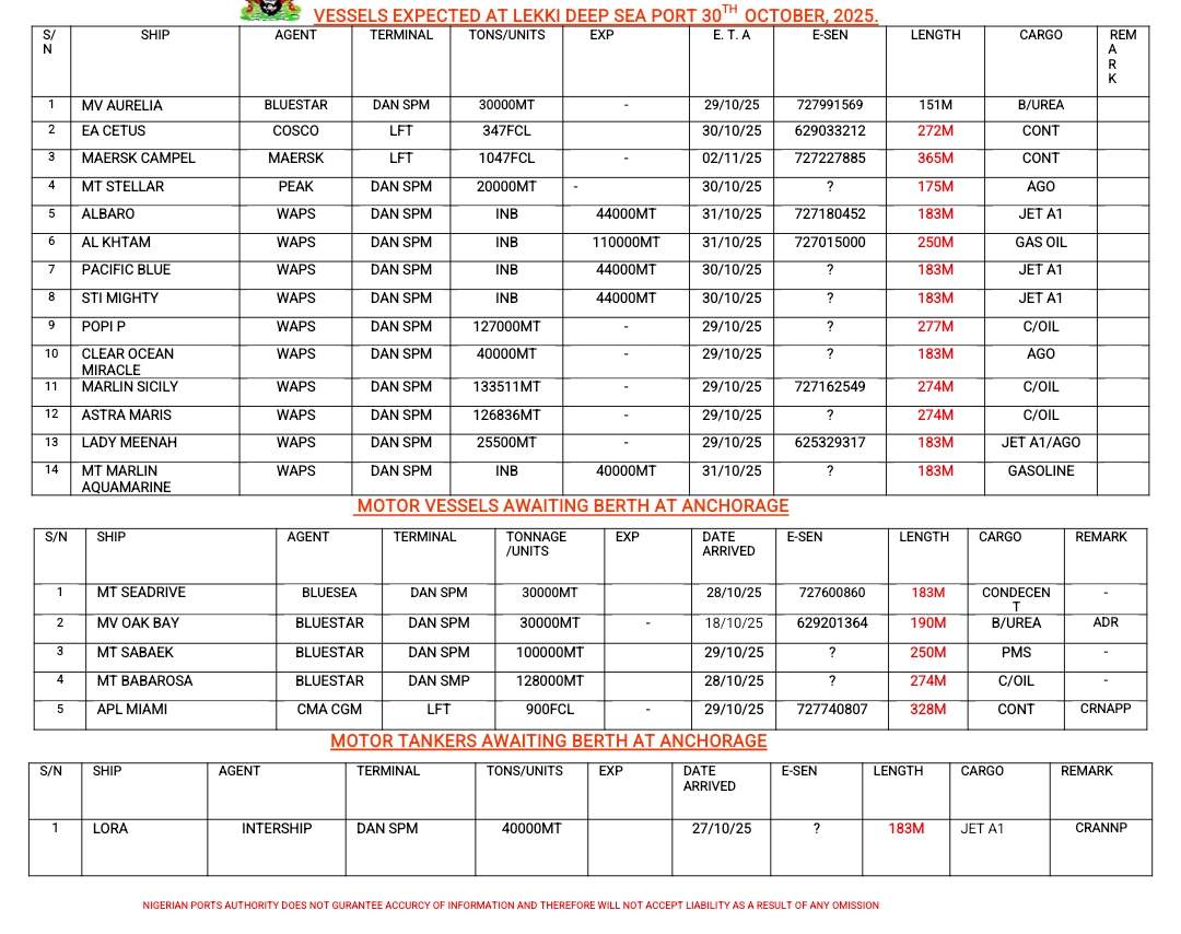 Vessels Expected At Lagos Ports As At 31st October, 2025