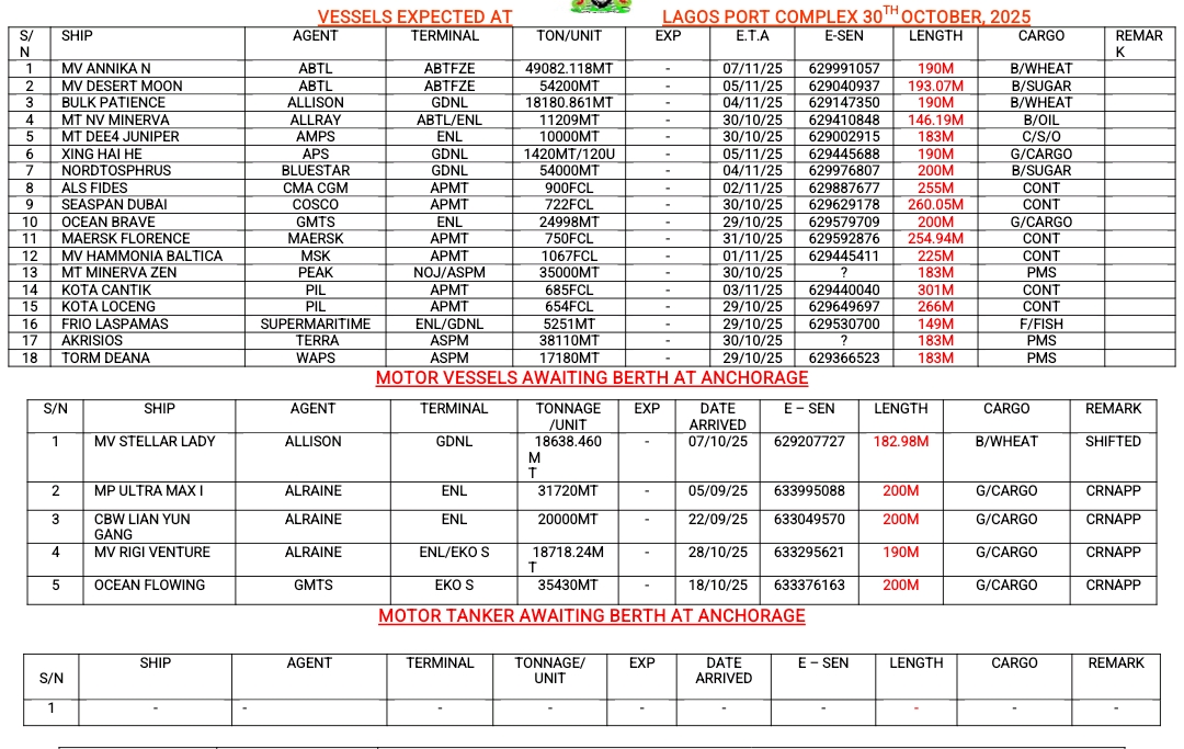 Vessels Expected At Lagos Ports As At 30th, 2025