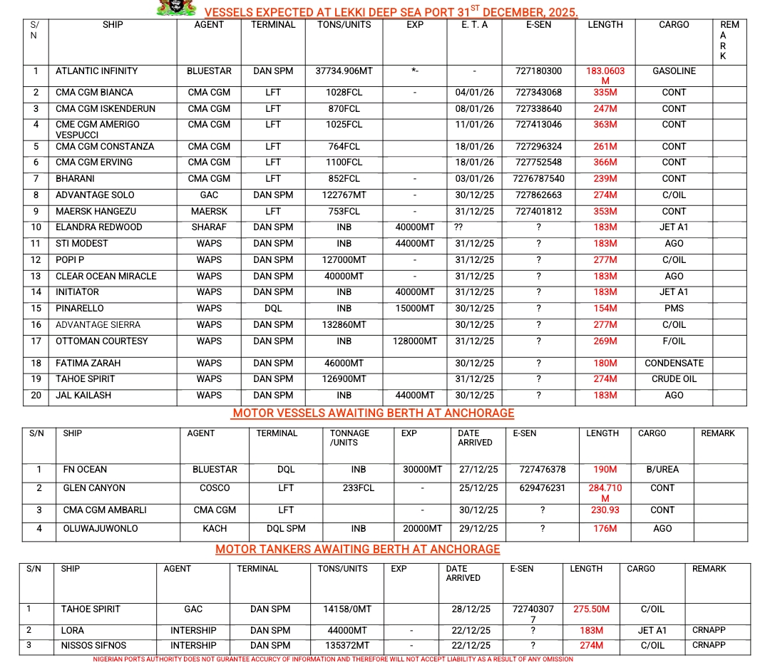 Home » Vessels Expected At Lagos Ports As At 31st December, 2025