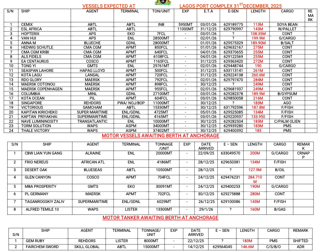 Vessels Expected At Lagos Ports As At 31st December, 2025