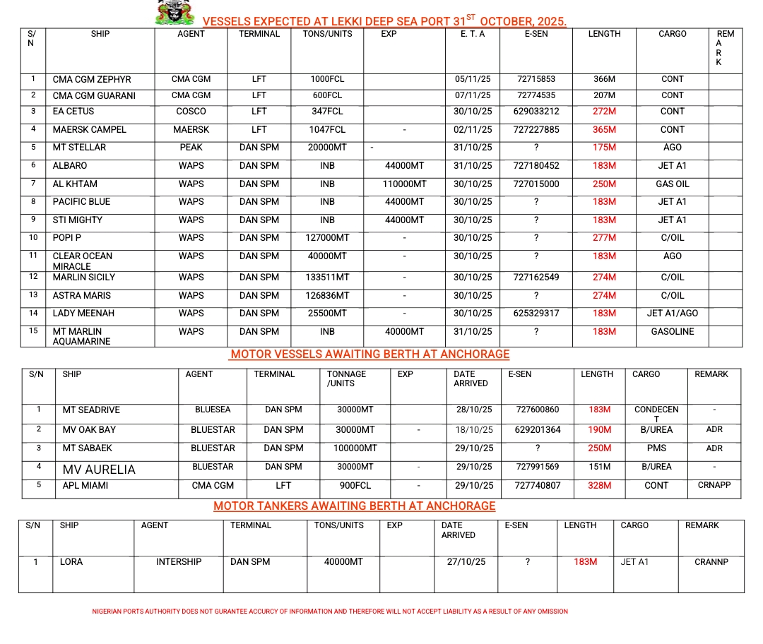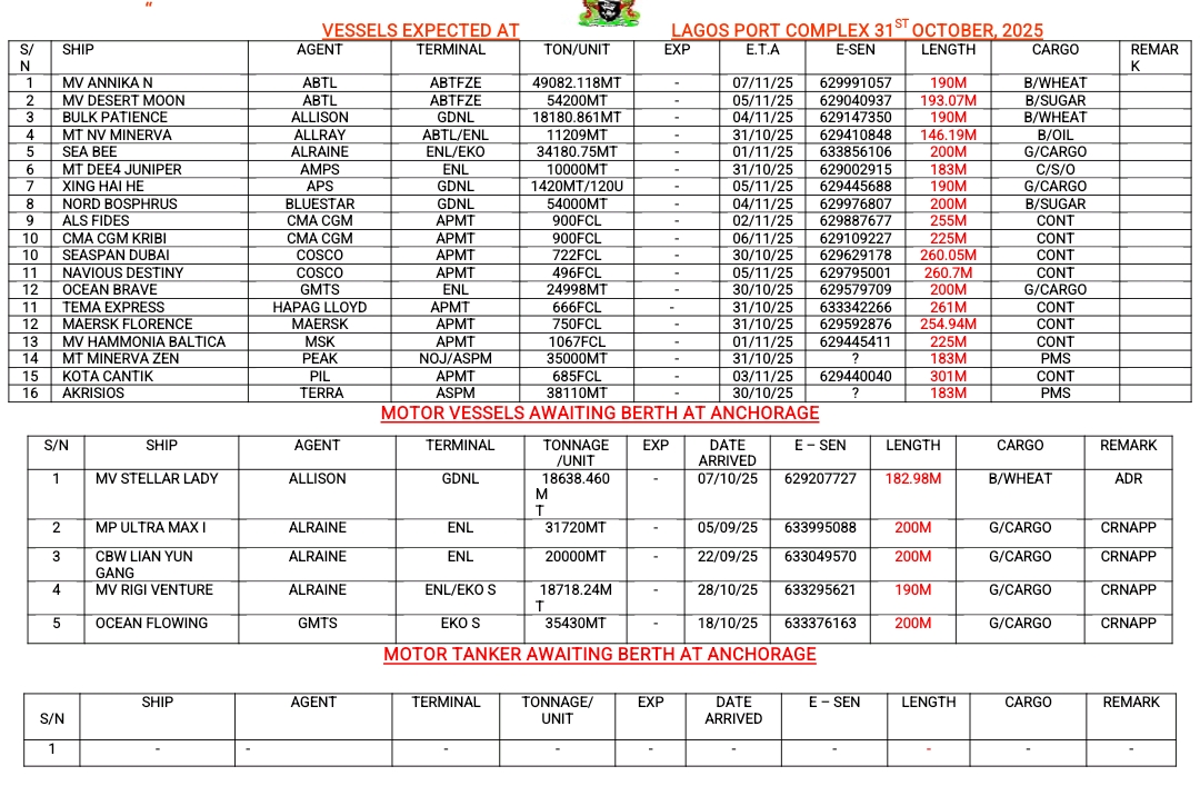 Vessels Expected At Lagos Ports As At 31st October, 2025