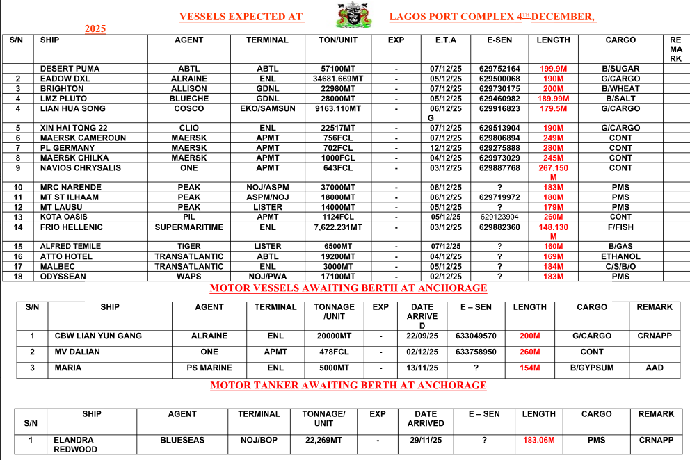 Vessels Expected At Lagos Ports As At 4th December, 2025