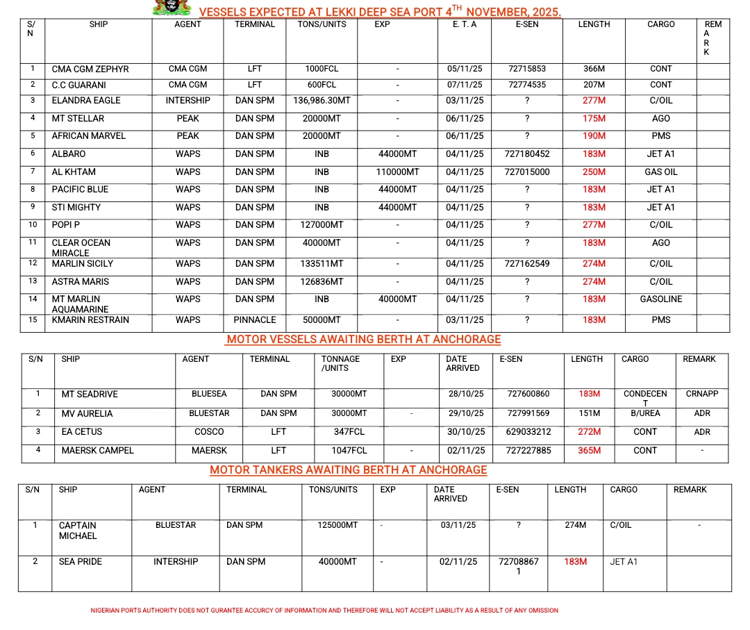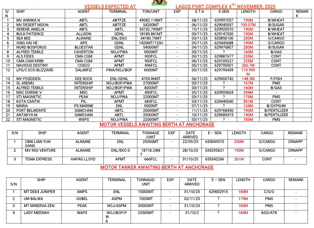 Vessels Expected At Lagos Ports As At 4th November, 2025