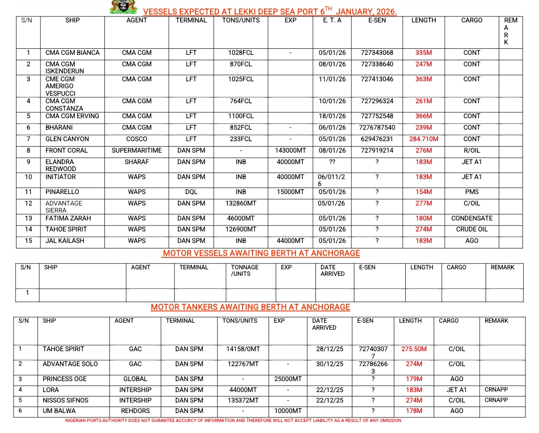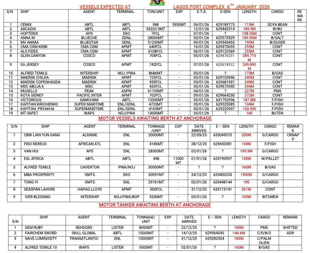 Vessels Expected At Lagos Ports As At 6th January, 2026