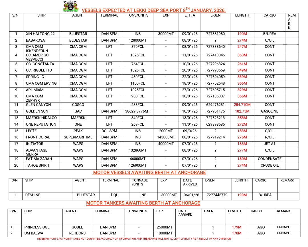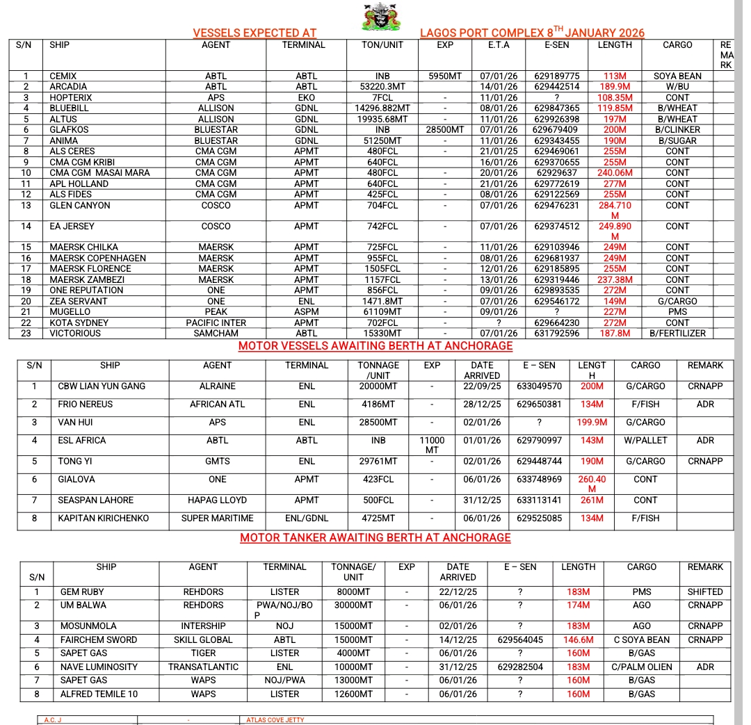 Vessels Expected At Lagos Ports As At 8th January, 2026